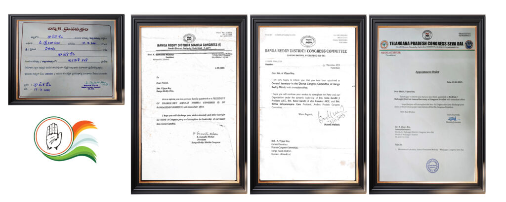 - In 2013, Vijaya Roy was appointed as the General Secretary of the Ranga Reddy District Congress Committee.